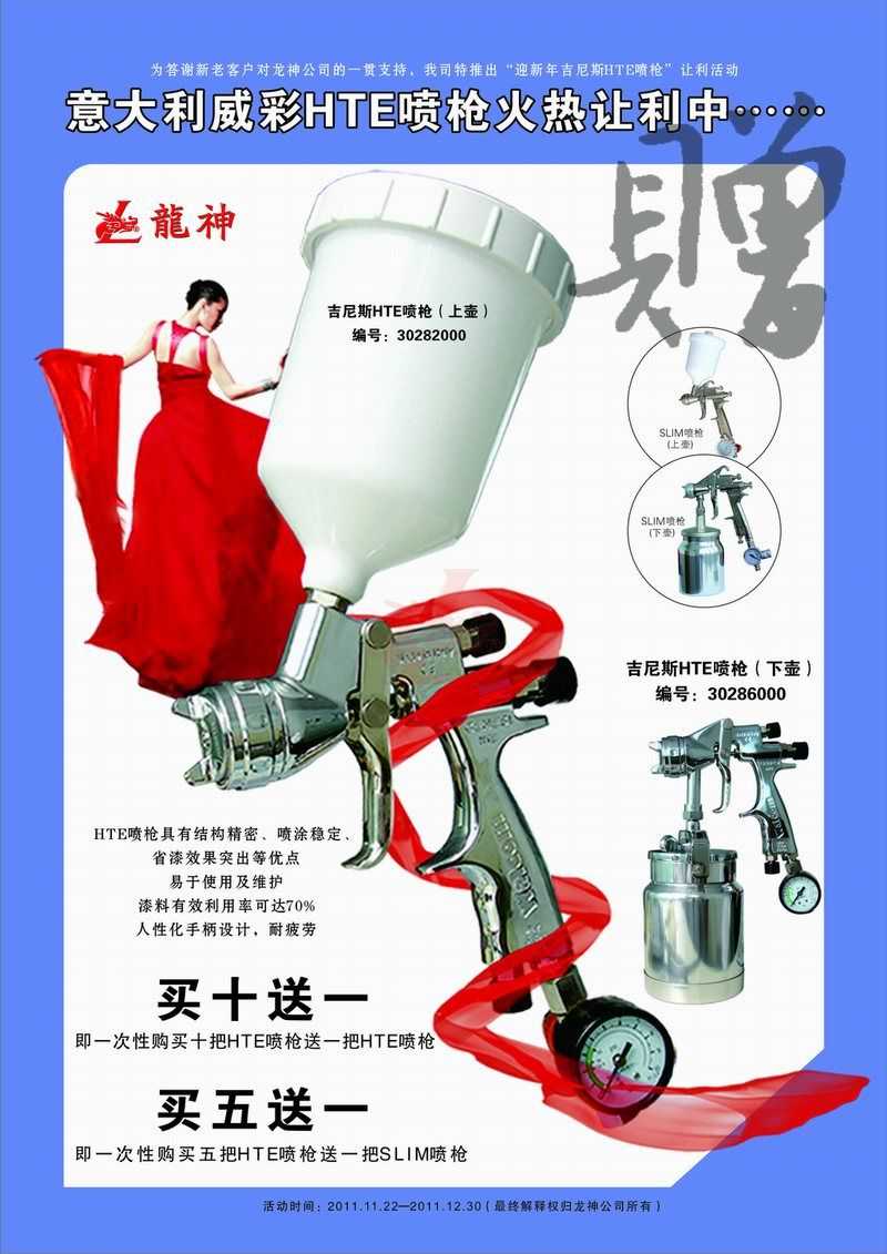 吉尼斯HTE噴槍11月促銷 吉尼斯HTE噴槍2011年11月促銷 (活動已結(jié)束,感謝您的關(guān)注) 一、主題: 吉尼斯HTE噴槍讓利促銷 二、活動目的: 讓利回饋給力促銷 三、活動時間: 1、 時間:2011年11月21日至2011年12月30日 2、 時長:共計(jì)40天 四、活動內(nèi)容: 1、 買十送一(即一次購買十把HTE噴槍送一把HTE噴槍) 2、 買五送一(即一次購買五把HTE噴槍送一把SLIM噴槍) 市場部 2011年11月17日 宣傳海報(bào) 2011-11-19 12898